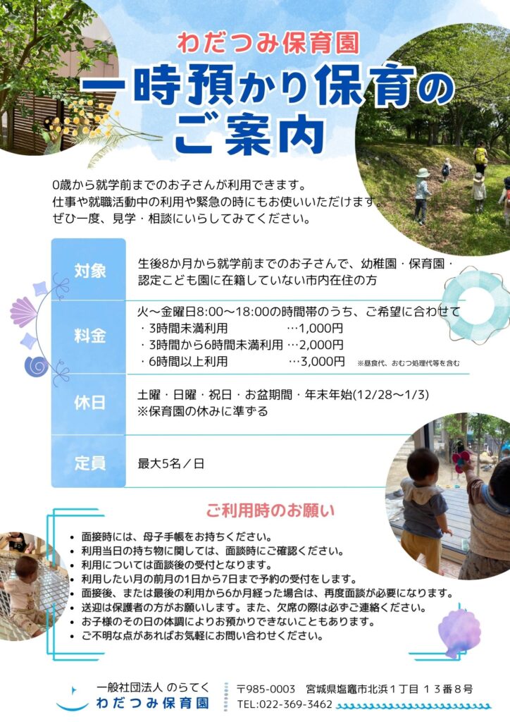 一時預かり事業の受付をしておりますので、ご希望の方はご連絡ください(022-369-3462)